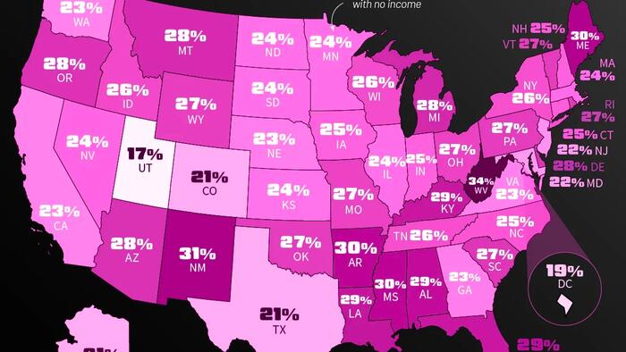 West Virginia stands out with the highest share of households reporting no income at 34%, three percentage points ahead of New Mexico at 31%.