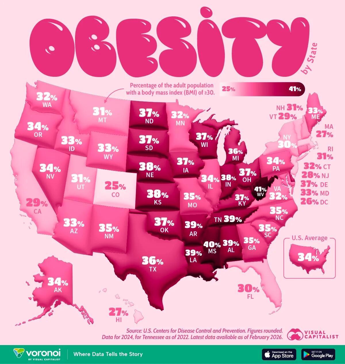 More than one in three adults is obese in most U.S. states, according to the latest CDC data. In several Southern states, the rate now exceeds 40%.