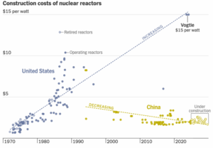 Via the NYT, while nuclear construction costs in the United States skyrocketed after the 1960s, they fell by half in China during the 2000s and have since stabilized. China provides three state-owned nuclear developers with cheap government-backed loans to build new reactors, which have significant value as financing can be one-third of the costs for nuclear plants. The Chinese government also requires electric grid operators to buy some of the power from nuclear plants at favorable rates. China’s nuclear companies build only a handful of reactor types, and they do it continuously, allowing developers to perfect the construction process, streamline licensing, and simplify supply chains. China’s national mandate to expand nuclear power incentivizes companies to invest in domestic factories and a dedicated engineering workforce. Near Shanghai, giant reactor pressure vessels are being continuously forged by teams of specialized welders, ready to be shipped to new projects. China is expected to have the world’s largest nuclear power capacity by 2030, surpassing the United States.