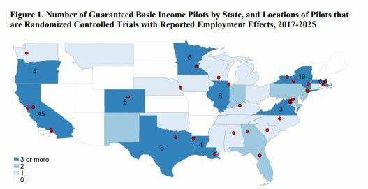 A new AEI working paper by Kevin Corinth and Hannah Mayhew gives the best recent overview of the evidence. Per their study, there were 122 guaranteed basic income pilots across 33 states and the District of Columbia between 2017 and 2025. Those pilots allocated about $481.4 million in transfers to 40,921 recipients, with 61,664 total participants including control groups. The average recipient got about $11,765, the average pilot lasted 18.4 months, and the average monthly payment was $616.