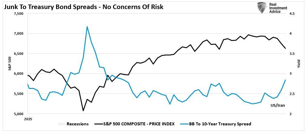 The bulls will argue that CDX spreads are widening from historically tight levels and that the absolute level of stress remains modest by historical standards. That’s technically accurate, as shown, Treasury-to-Junk Bond spreads in early 2026 are not at the panic levels seen in 2008 or 2020. So why worry?