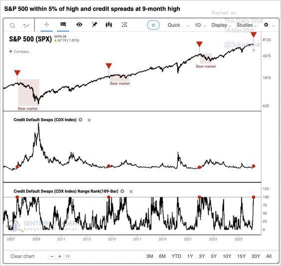 The chart from Sentiment Trader below tells the story as clearly as any amount of prose could. The top panel tracks the S&P 500 since 2007. The middle panel shows the CDX Index of credit default swaps. The bottom panel shows where those spreads stand relative to their 189-bar range, essentially a percentile reading of how elevated they are relative to recent history. (Red markers indicate instances where CDX spreads hit 9-month highs while the S&P 500 is within 5% of its high.)