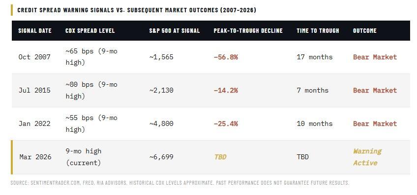 Notice that each red arrow marks a moment when CDX spreads reached a nine-month high while stocks remained near their all-time highs. The 2007 signal preceded the worst financial crisis since the Great Depression. The 2015 signal preceded a sharp correction and an extended period of volatility. The 2022 signal arrived just before the Federal Reserve’s aggressive rate-hiking campaign drove the S&P 500 down 25%. And now, in early 2026, the signal has triggered again.
