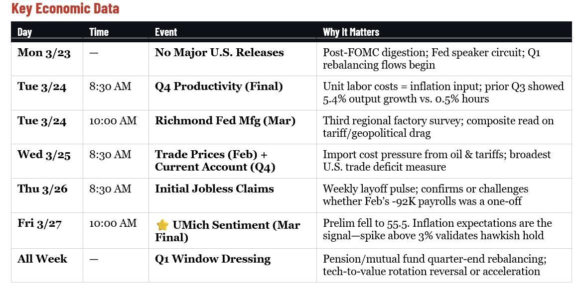 Underneath the data, the real story is mechanical: Q1 ends March 31. Pension funds and institutional allocators begin quarter-end rebalancing and window dressing. After the sharp rotation out of tech and into value that defined the first quarter, the question is whether those flows reverse or accelerate. In a thin-catalyst week, flow-driven moves can be outsized.
