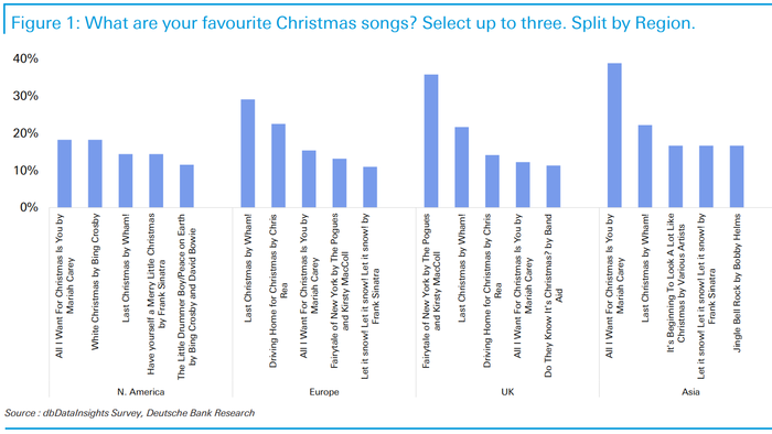 At a global level, the bank’s 2026 Year Ahead Global Markets Survey found that Wham! won again, while regionally, Mariah Carey took the crown in the US, Asia, and the Rest of the World with All I Want For Christmas is You. The full list is in the report.