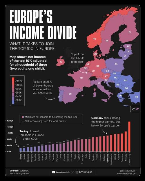 The income threshold for being considered rich in Europe varies considerably from country to country.