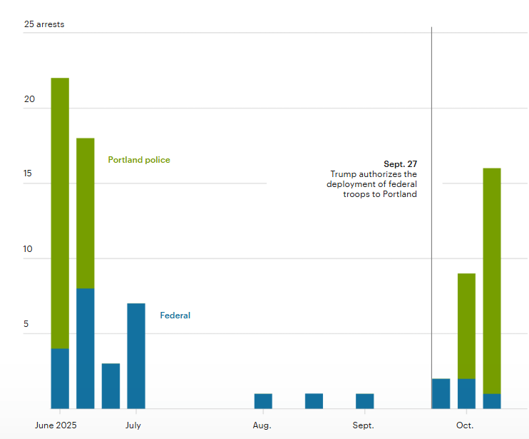 In addition, while protests continued across the summer, most of the alleged action by protesters that resulted in federal prosecution or local arrests ended two months before Trump said troops were needed in Portland.