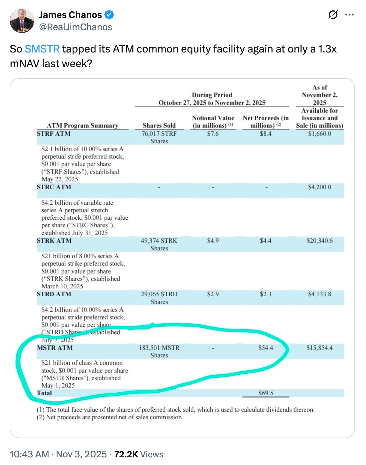 Short-seller Jim Chanos has been warning about this structure for years. Chanos’ core point remains timely: as long as the company borrows or dilutes shareholders to accumulate Bitcoin, it is exposed not only to BTC price risk, but to the same liquidity crunches that force other leveraged holders to capitulate when conditions turn.