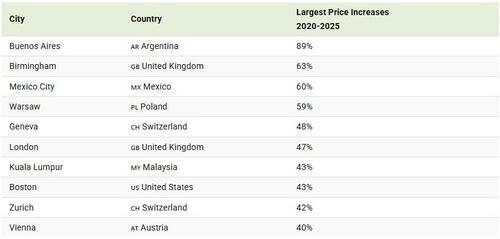 Meanwhile, European cities account for six of the 10 largest price increases, with Birmingham, UK leading at a 63% surge. Warsaw, Poland follows closely with a 59% jump, fueled by higher excise taxes and persistent inflation.