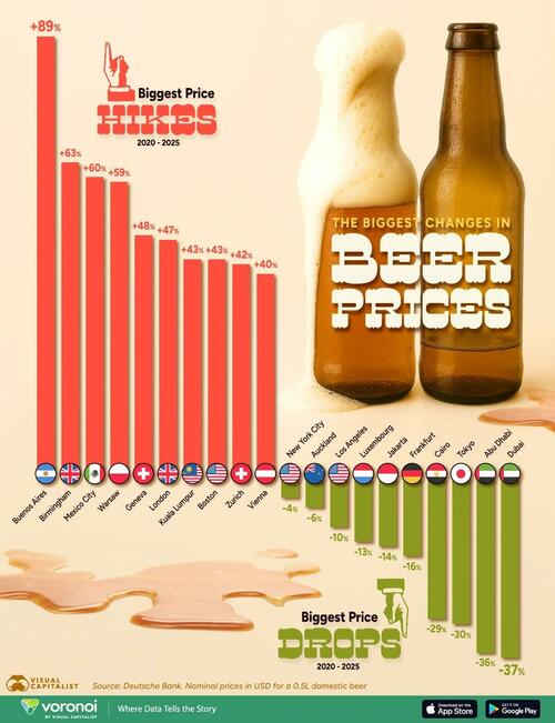 This graphic, via Visual Capitalist’s Dorothy Neufeld, shows the cities with the steepest beer price increases and decreases in the last five years, based on data from Deutsche Bank.