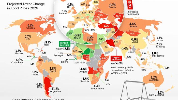 This map, via Visual Capitalist’s Dorothy Neufeld, ranks 160 countries by their projected year-over-year change in food prices, highlighting where households are likely to face the steepest increases in 2026.