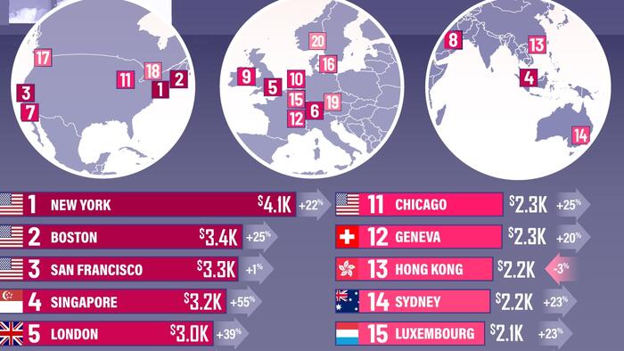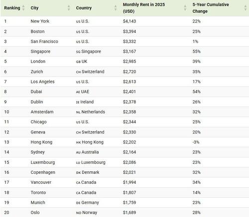 Beyond America, Singapore stands as the most expensive, with rent surging 55% over the period to reach $3,167—the fastest growth rate on the list. Similarly, rental costs are up 54% in Dubai, making it the costliest city to rent in the Middle East and ranking eighth overall in 2025.