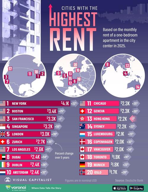 This graphic, via Visual Capitalist’s Dorothy Neufeld, shows the cities with the most expensive rent in the world, based on data from Deutsche Bank. Figures are in nominal U.S. dollars.