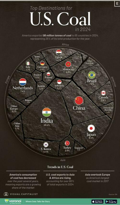 This visualization, via Visual Capitalist’s Marcus Lu, breaks down the top destinations for U.S. coal exports last year. The data for this graphic comes from the U.S. Energy Information Administration (EIA). It shows 2024 coal export volumes by destination, measured in millions of tonnes.