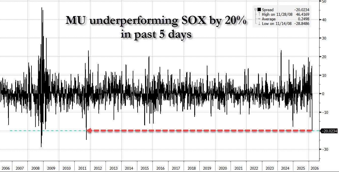 In his EOD wrap, Goldman tech specialist Peter Callahan wrote that while there wasn’t that much actual “angst” out there, his clients complained of plenty of “sanity checking” on the moves today in memory (MU / SNDK lower vs. OEMs higher) and especially “the 5 day slide in MU as Micron has underperformed the SOX by 20% in 5-days, starting with the company’s blowout earnings report; that move ranks as the largest 5 days of underperformance relative to Semis/SOX since 2011.