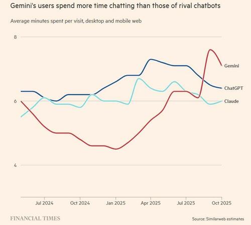 Bottom line: with more than 800 million weekly users, OpenAI – with its $1.4 trillion in circle-jerk commitments stretching into the 2030s on the provision that it remains the most important player in the industry – still has a dominant market share in overall chatbot usage but people are now spending more time chatting with Gemini than ChatGPT, and Google is clearly stealing users away from OpenAI.