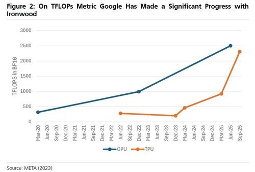 Here UBS chimes in that while the bank expects Google is open to the idea of broadening TPU ecosystem over time, any efforts to do so must limit potential cannibalization of GCP revenues. From that standpoint META and AAPL are both prime candidates for internal TPU capacity as they have large AI efforts supporting internal workloads, vast internal AI fleets, and relatively small levels of reliance on GCP (limiting risk to GCP AI cloud revenues). Furthermore, TPU is optimized for the JAX framework but also supports PyTorch through a PyTorch/XLA package, making the integration of META stack relatively easy. Still, any effort to stand up a TPU deployment would have to be weighed against the resources allocated to the META internal ASIC and AMD ramps.