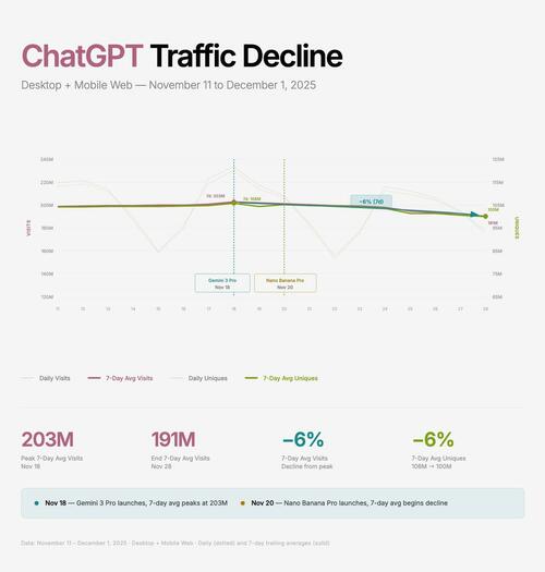 And another reason why the vibes will get rougher, as Deedy Das shows, in the 2 weeks since the Gemini launch, ChatGPT unique daily active users (7-day average) are down -6%. Expect this trend to continue.
