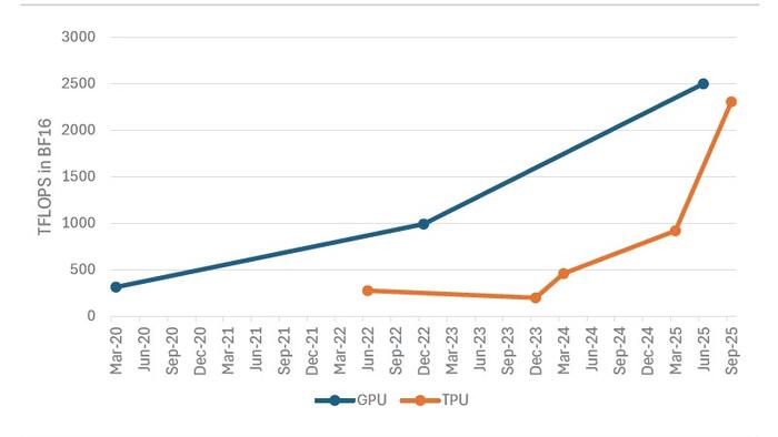 Arcuri notes that Ironwood has not been submitted to MLCommons’ MLPerf v5.1 datacenter training benchmark (the last round was November 12, 25), but given more compute resources, FP8 support, and far more HBM, he expects its per-chip performance to be notably above that of Trillium. Ironwood also advances TPU scale up with domains of up to 9,216 TPUs (vs 8,960 for v5p and just 256 for Trillium).