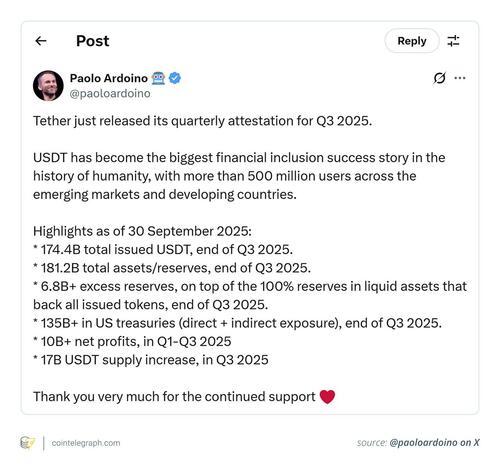 Its latest attestation shows $181.2 billion in reserves against $174.5 billion in liabilities, leaving $6.8 billion in excess and more than $174 billion in USDt in circulation. With interest rates high, that Treasury-heavy portfolio has generated over $10 billion in profit so far in 2025, a figure more typical of a financial institution than a crypto startup.