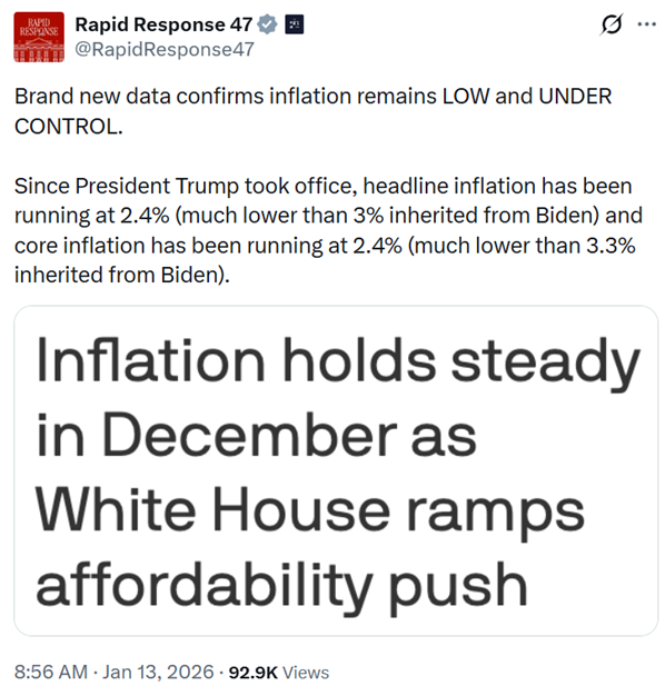 But CNN, true to form, immediately tried to make a relatively good report out to be a bad one in a January 13 X post: “US inflation remained at 2.7% in December, underscoring persistent cost of living challenges.”