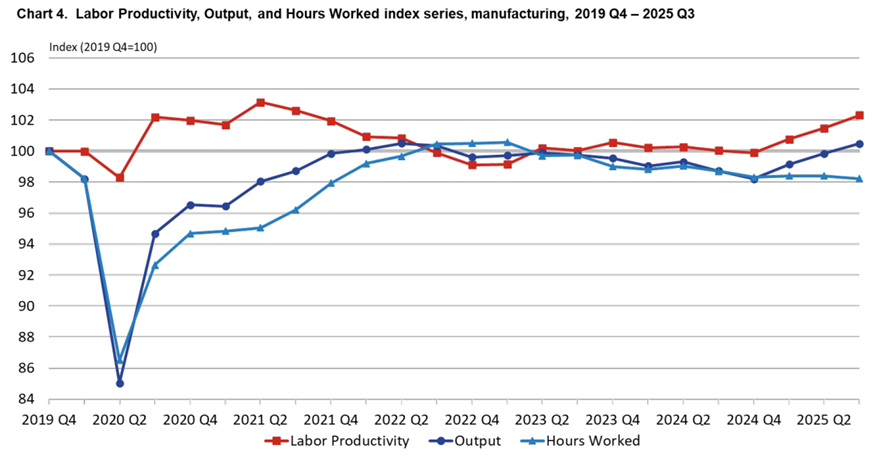 Labor productivity in the nonfarm business sector increased by 4.9 percent in the third quarter, with output increasing by 5.4 percent and hours worked rising by 0.5 percent. Manufacturing-sector labor productivity and output are rising markedly after declining during the Biden administration: