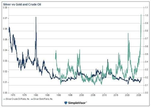 Silver investors often use ratios to assess silver value. Among the most widely used are the silver-to-gold and silver-to-oil ratios. The chart below shows both ratios. The silver-to-oil ratio (green) is at record highs going back to at least 1990. As the graph shows, there have been numerous spikes in the past. Assuming this too is a spike, either oil prices are ready to ramp higher, or silver is due for a mighty correction.