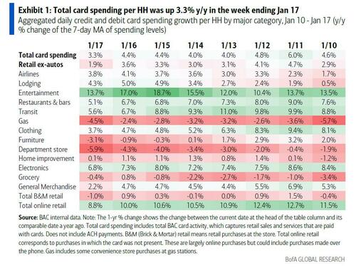 In his analysis Bhave used the latest BofA aggregated credit and debit card data (report available to pro subs) to zoom in on the effect of Viola. Total card spending was down 3.7% y/y in the week ending February 19, 2021, compared to a trend of about +6% y/y in prior weeks.