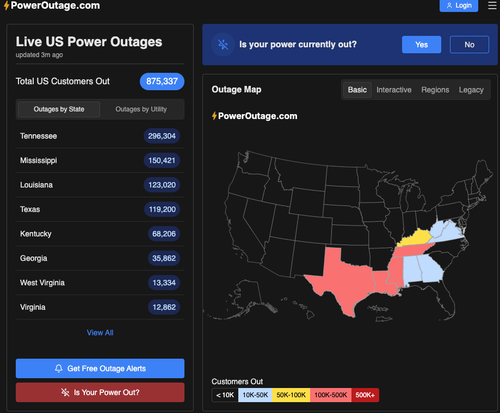 Power outage tracking website PowerOutage.com shows nearly 900,000 customers from Texas to Virginia without electricity. Tennessee has the highest number of outages at nearly 300,000, followed by Mississippi with about 150,000.