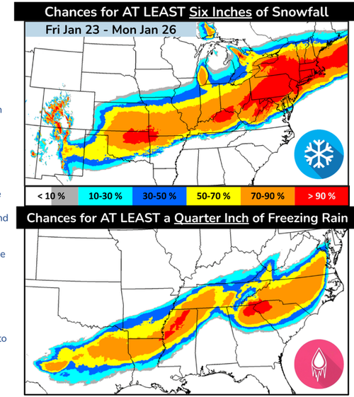 NOAA’s latest forecast shows freezing rain concentrations from Texas to the Carolinas, with six-inch snowfall probabilities concentrated in Appalachia. Ice accumulation is expected across the region through January 26.