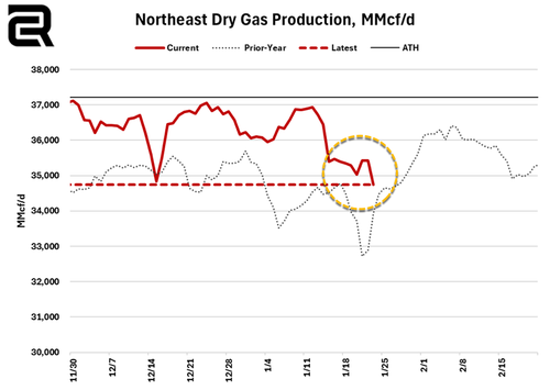 Appalachian volumes already plummeted 682/d to 34,745 MMcf/d as the ongoing cold snap hit supply. The region is down 2,189 MMcf/d versus recent two-week highs.