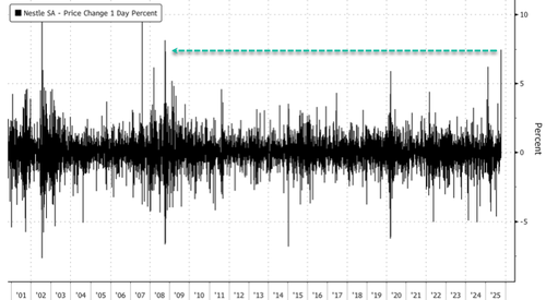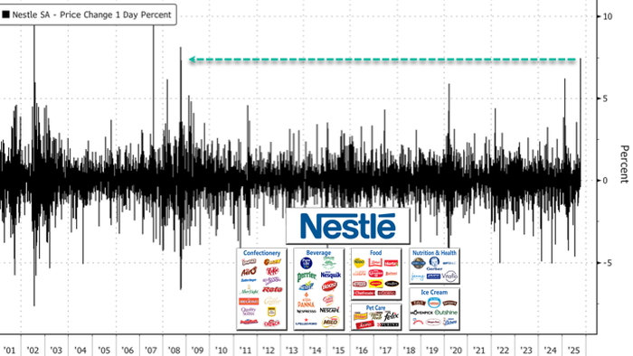 Shares of Swiss food giant Nestlé SA jumped more than 8% in Switzerland today, marking the largest intraday gain in 17 years. This followed the company’s announcement of an acceleration in its turnaround efforts, including aggressive restructuring measures such as slashing 16,000 jobs, or about 6% of its global workforce, over the next two years.