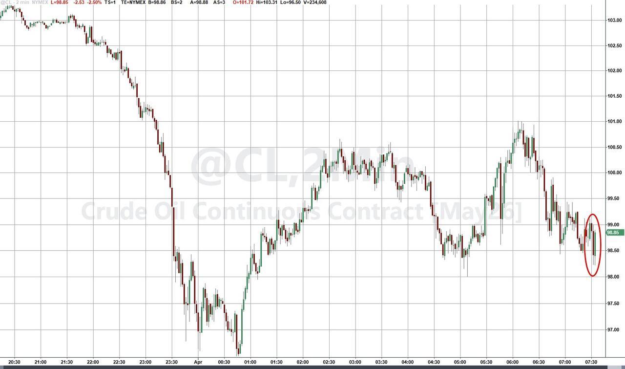 Oil prices are down overnight but playing headline roulette with every word that comes out of any leaders’ (or non-leaders’) mouth as ceasefire chatter (now denied) has WTI riding a roller-coaster (but below $100 once again as we write).