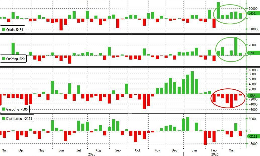 A sizable crude build (the sixth weekly rise in total US crude stocks in a row) was mirrored by the seventh weekly drawdown in gasoline stocks
