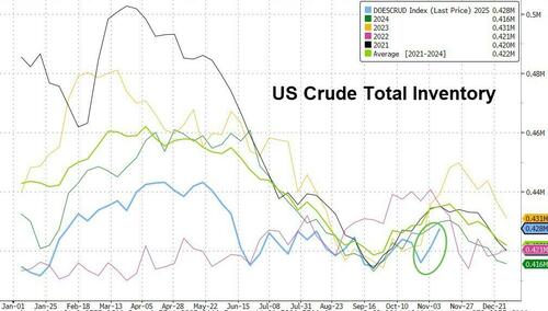 The last two weeks have lifted US crude stocks to their highest in five months, but we note on a seasonal basis, it continues to lag recent years…