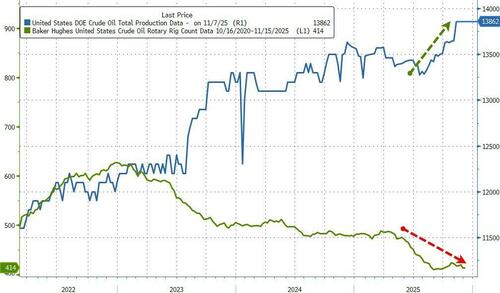 US Crude production surged by over 200k b/d last week to a new record high despite the ongoing slide in the rig count…