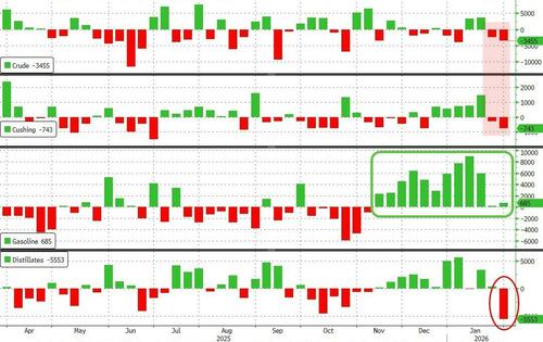 The official data showed a sizable crude draw (but considerably less than API reported) as distillates saw their biggest drawdown since Feb 2021. Bloomberg’s Will Zubanskuy notes that the largest portion of that distillates draw came from PADD 1, which includes the East Coast — where homes in the Northeast lean on heating oil to warm their houses in frigid temperatures. Adding to the demand, diesel and oil-fired power plants start running when the grid comes under strain and some utilities begin pulling from heating oil for certain customers instead of natural gas when supply of the latter gets tight.