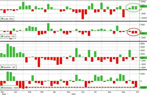he official crude build of 3.52mm barrels was modest (and well below the huge 7.4mm barrel build reported by API). That is the 3rd weekly build in crude stocks in a row (and 3rd weekly draw in stocks at Cushing). Distillates inventories plunged by 4.53mm barrels – the biggest draw since January – perhaps affected by the El Segundo refinery fire