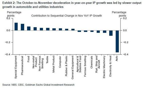Incorporating October-November activity data, Goldman’s GDP tracking model based on the production approach points to a small downside risk to our Q4 real GDP growth forecast of 4.5% yoy.