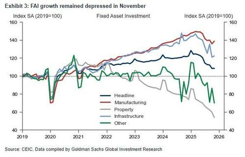 Fixed asset investment (FAI) maintained its double-digit year-on-year contraction in November on a single-month basis, though we would not over-interpret its recent slump as our study suggests that the NBS statistical correction of previously over-reported data has played at least as large a role as fundamental factors (e.g., the “anti-involution” policies and a prolonged property downturn).