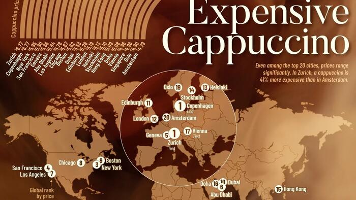 This visualization ranks the most expensive cappuccinos among the 69 major cities covered in Deutsche Bank’s Mapping the World’s Prices 2025 report.